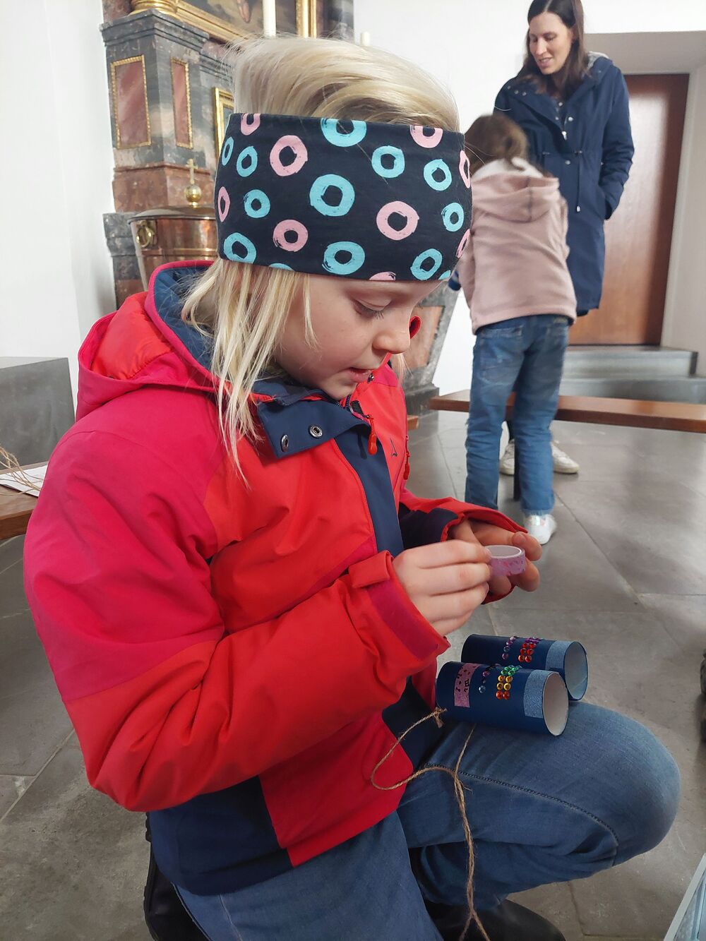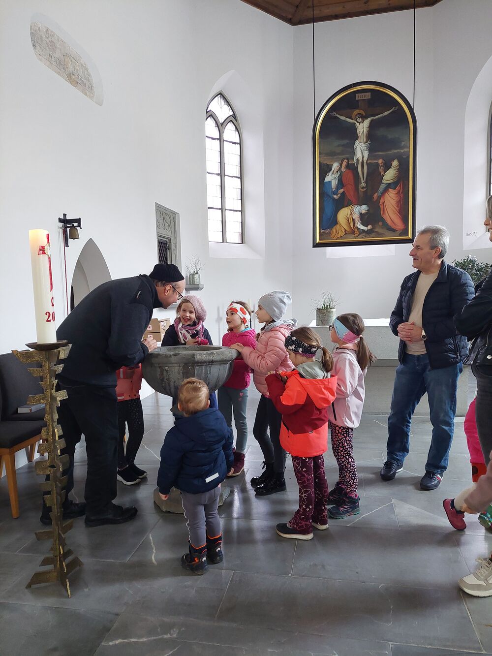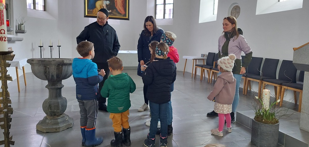 Ein Blick durch das selbstgebastelte Fernrohr und dann ging es los auf Entdeckungstour durch die Kirche. In Gruppen besuchten die Kinder die verschiedensten Stationen. Die Sakristei wurde von Dietmar Hirschbühl erklärt, Pfarrer Ratz ließ die Augen beim neuen Taufbecken, der Osterkerze sowie dem Altar strahlen. Sandra stimmte mit den Kindern die Orgel an und mit Anna wurden bei den Opferkerzen Wünsche zu Gott gesendet und den Beichtstuhl begutachtet. Zum Abschluss durften die Erstkommunionskinder noch den Kirchturm erklimmen.